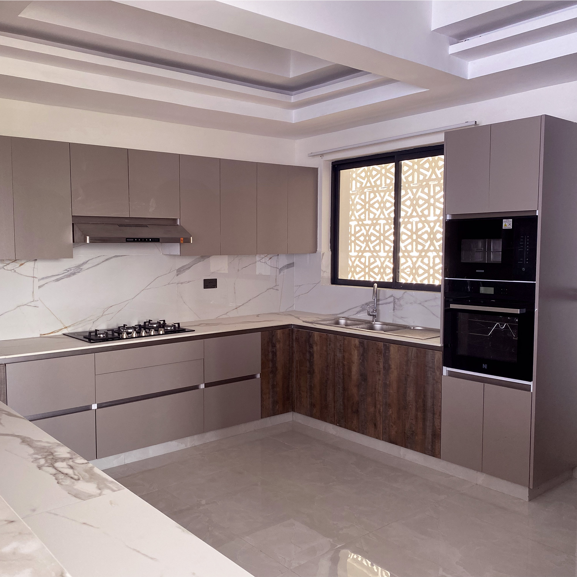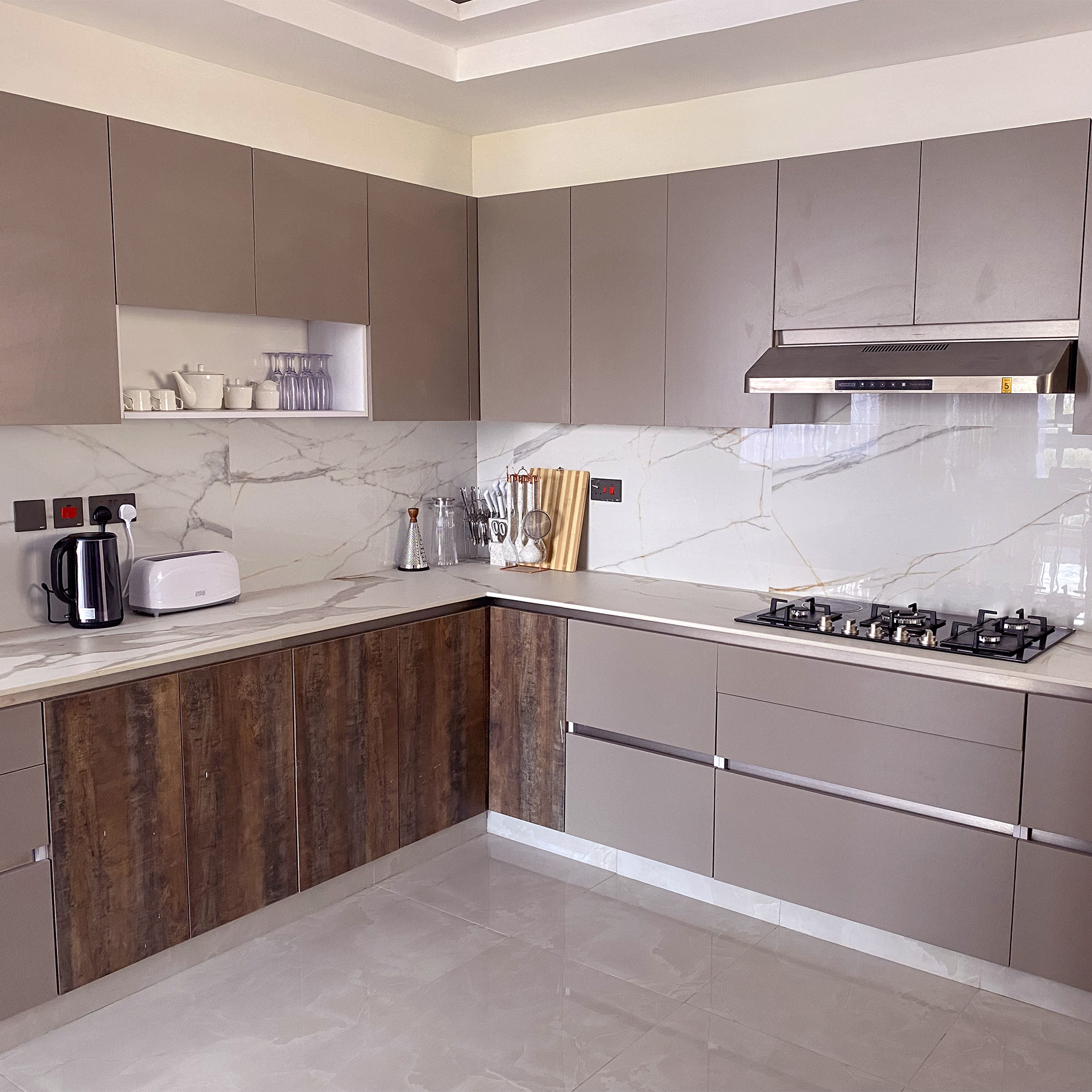 Open-plan kitchen with pantry